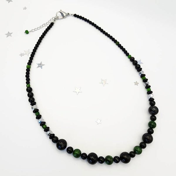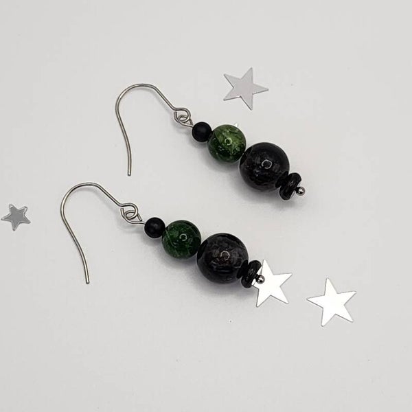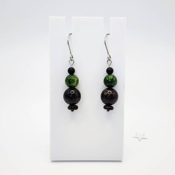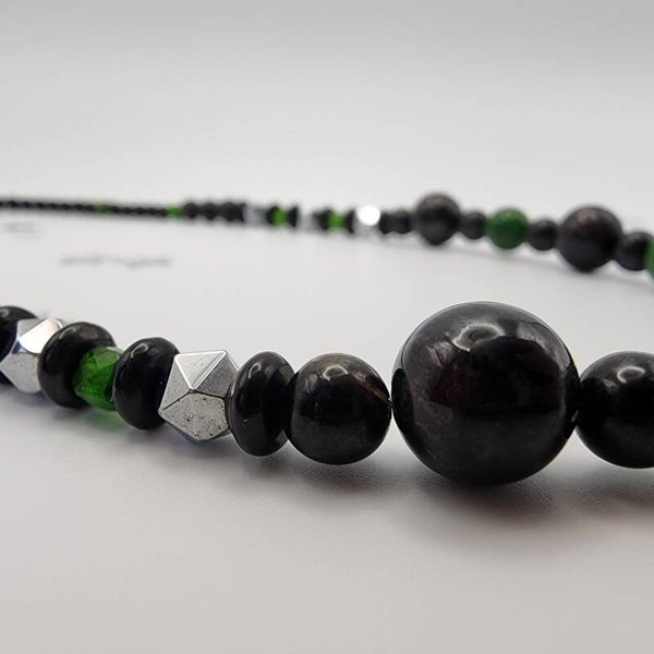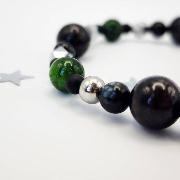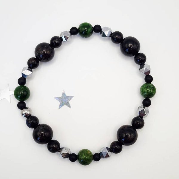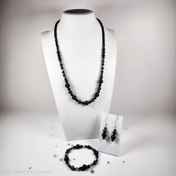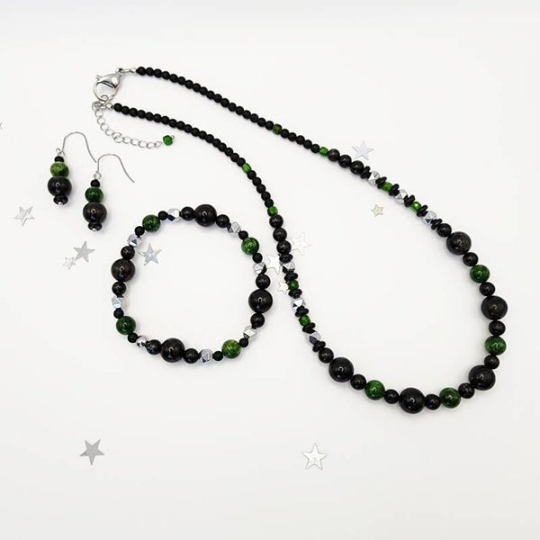 Unique jewelry set featuring AAA Chrome Diopside, AAA Hypersthene, AAA Matte Black Onyx, star-cut Hematite, and Shungite, this trio exudes confidence and calm. The adjustable 19.5–21.5" necklace pairs perfectly with a 7" stretch bracelet and matching dangle earrings, all finished with tarnish-resistant stainless steel components for enduring shine and strength.