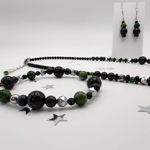 Chrome Diopside, Hypersthene, Matte Onyx & Shungite Necklace Set with Bracelet and Earrings