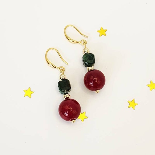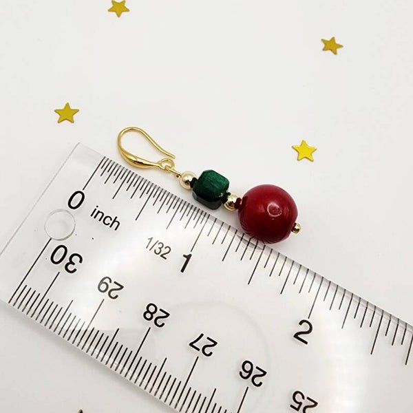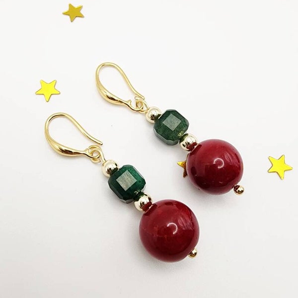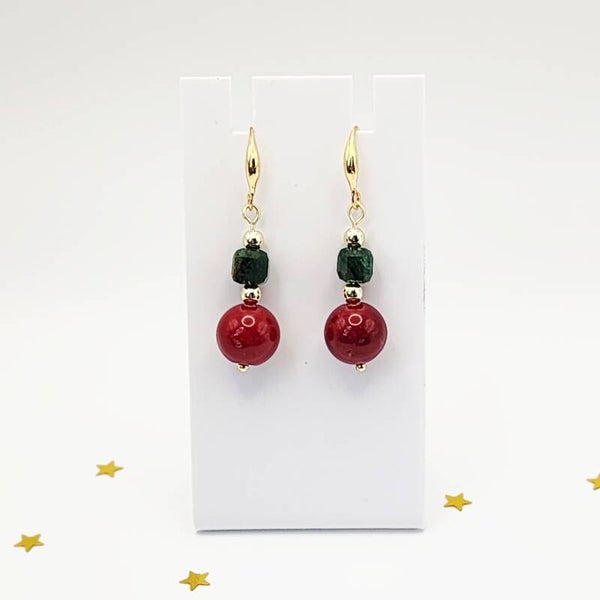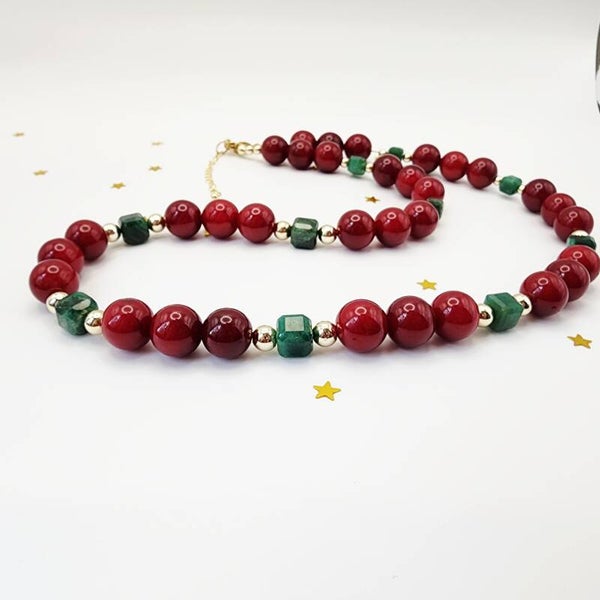 Stunning handcrafted jewelry set featuring a 23.5–25.5" adjustable Red Jade and Emerald necklace, 7.5" stretch bracelet, and matching dangle earrings. Accented with 18K gold, this set combines the deep, passionate red of natural Red Jade with the lush green brilliance of Emerald for a look that’s both bold and elegant. Perfect red and green for the holidays!