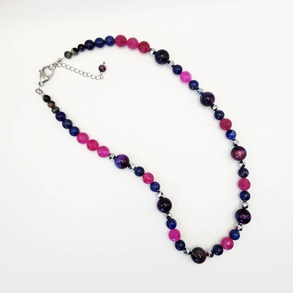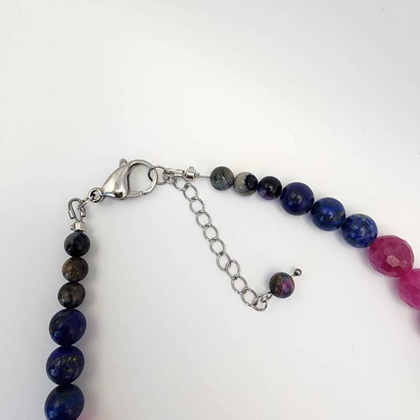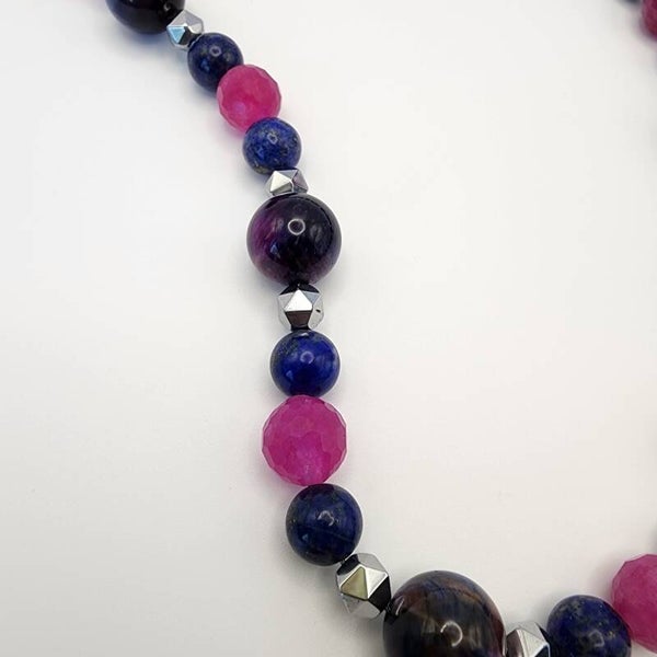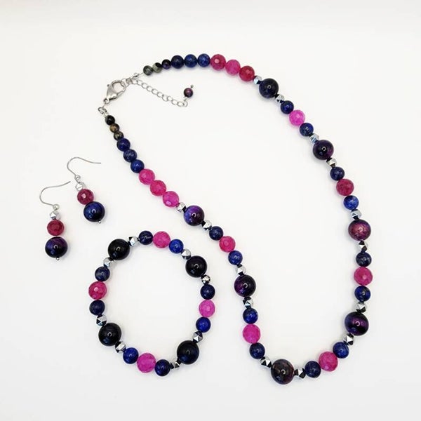 Vibrant and full of cosmic energy, this handcrafted jewelry set features a Galaxy Tiger Eye, Watermelon Tourmaline, and AAA Lapis Lazuli necklace with a matching stretch bracelet and coordinating earrings. Made with durable stainless steel components, this set offers both strength and lasting shine.