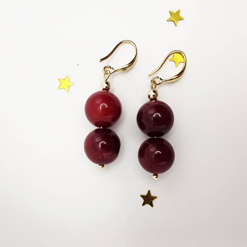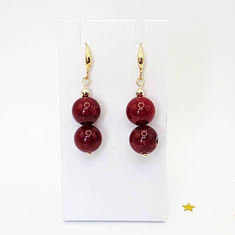 Gorgeous Red Jade pair of dangle earrings made with hypoallergenic 18k gold filled earwires.