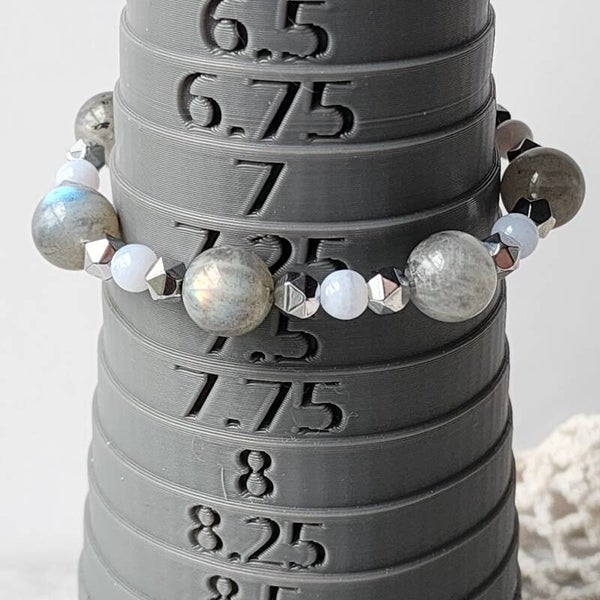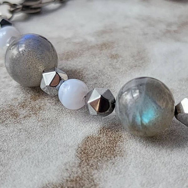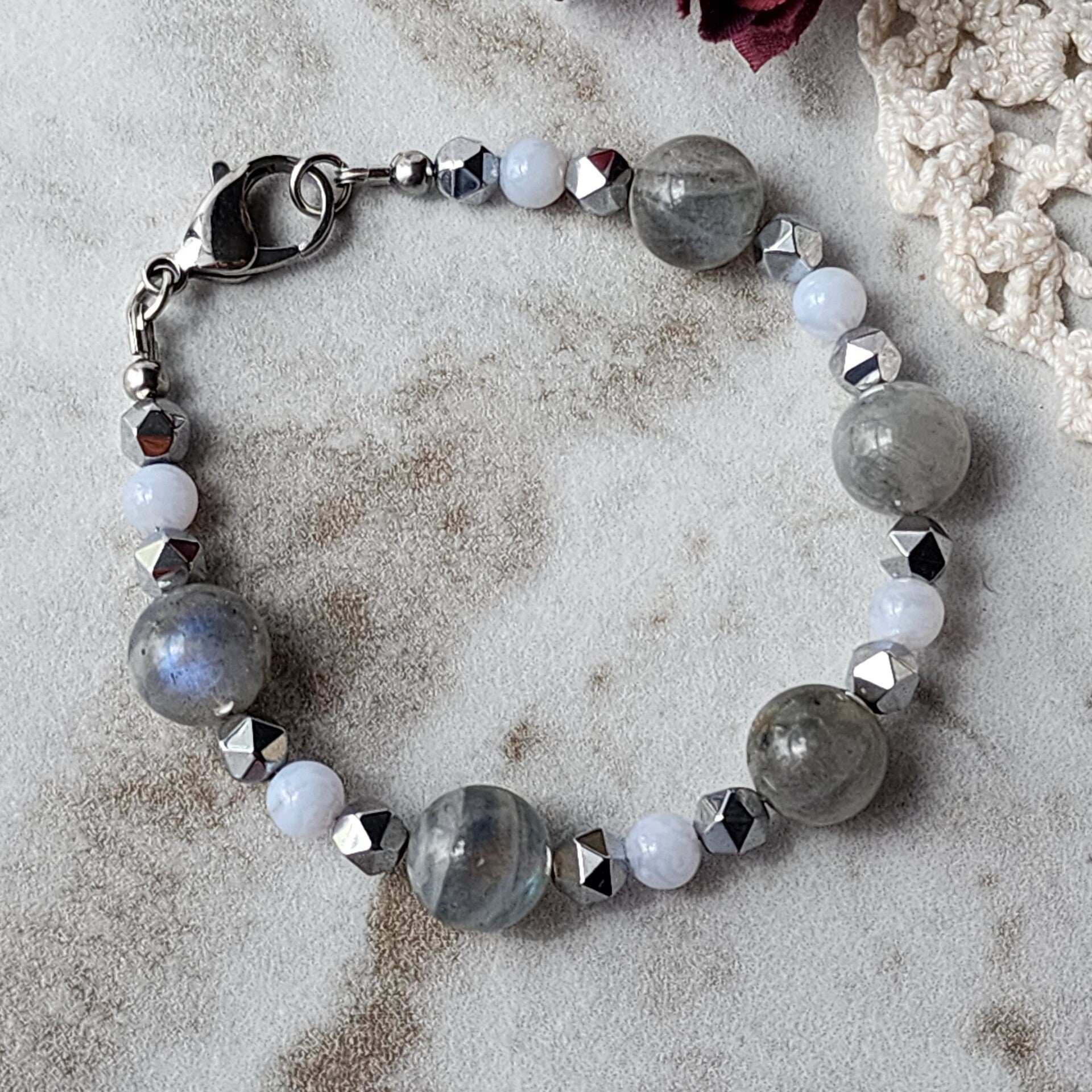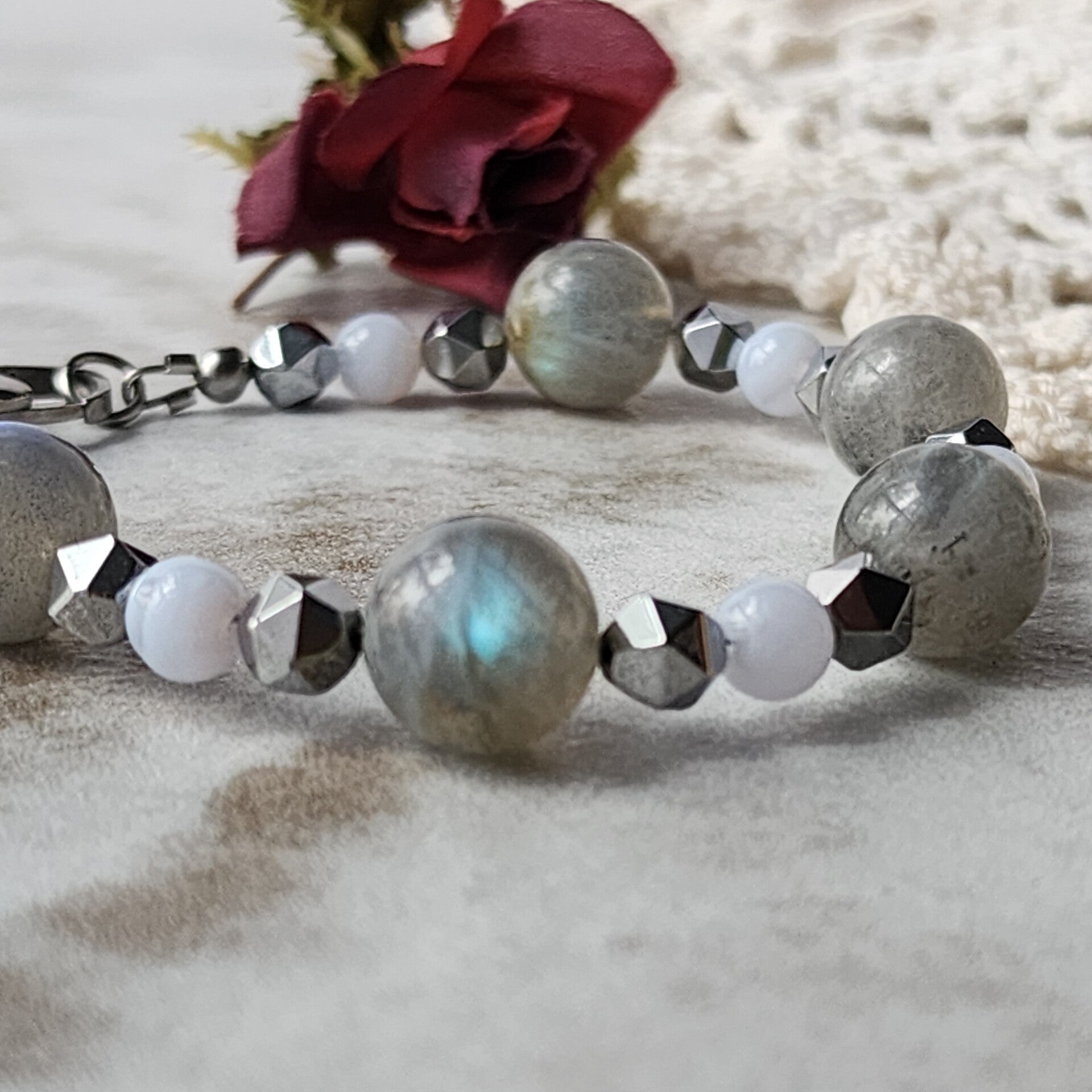 Elegant and serene, this handcrafted bracelet features mesmerizing AAA Labradorite, AAA Chalcedony Blue Lace Agate, and shimmering Star-Cut Hematite.