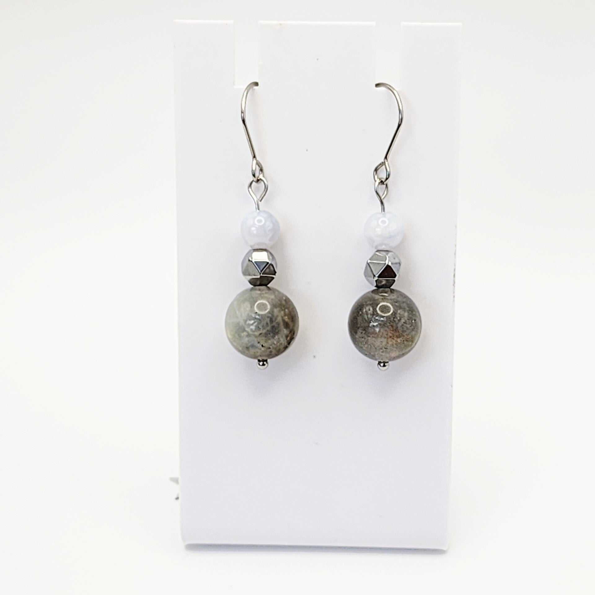 Labradorite, Chalcedony Blue Lace Agate, Hematite Pair of Dangle Earrings, Stainless Steel