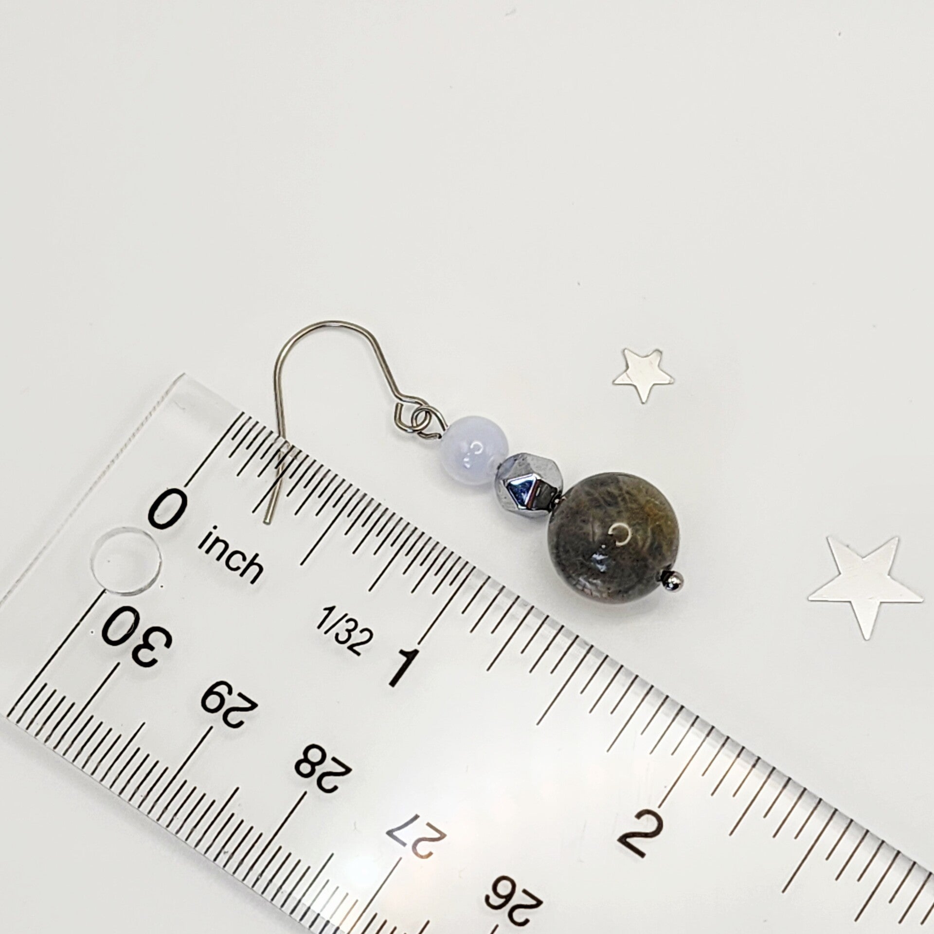 Elegant and serene, this handcrafted pair of dangle earrings features mesmerizing AAA Labradorite, AAA Chalcedony Blue Lace Agate, and shimmering Star-Cut Hematite.
