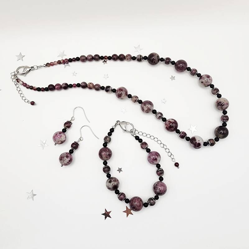 Plum Tourmaline, Black Onyx Bracelet, Hypoallergenic Stainless Steel