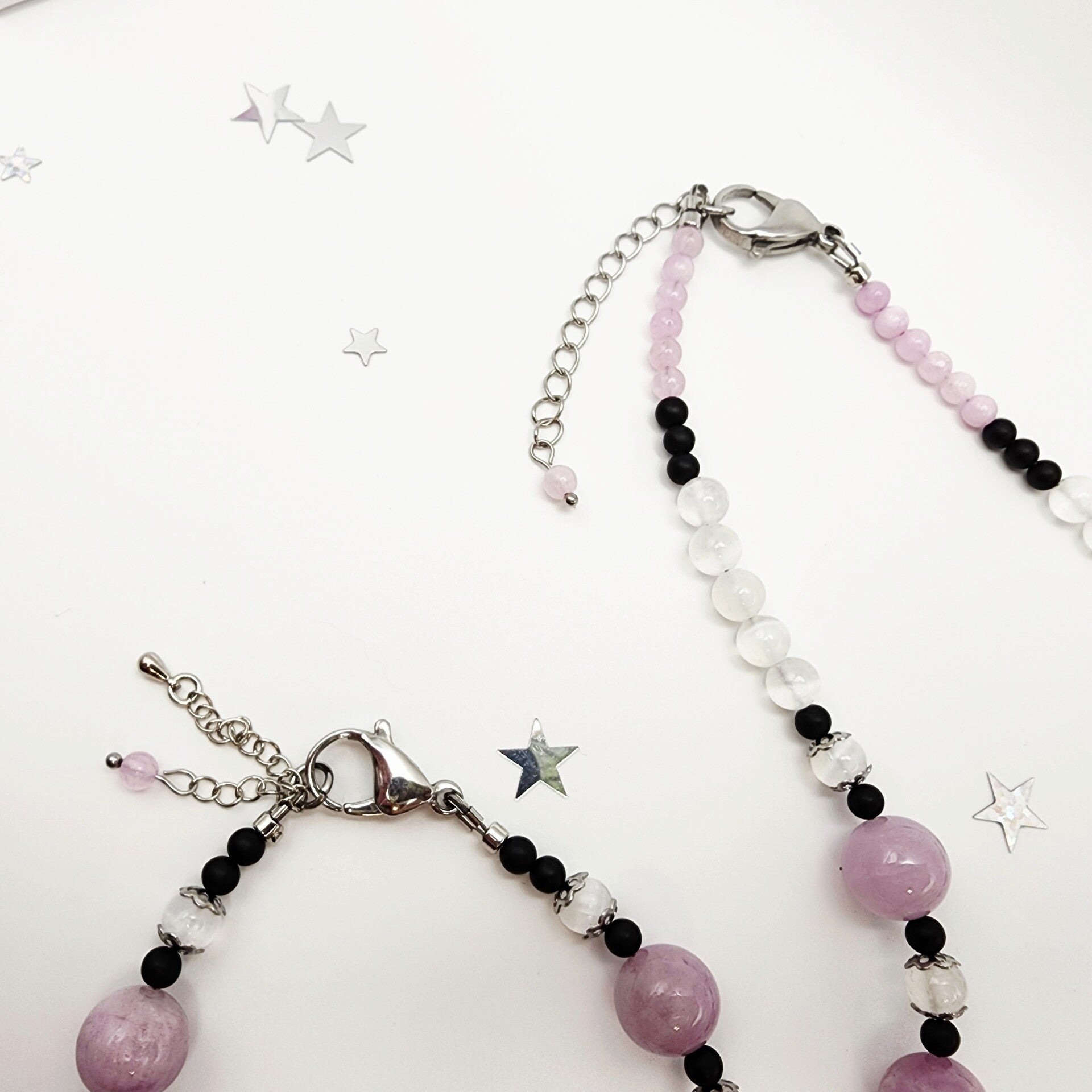 Handcrafted pink AAA Kunzite, milky white AAA Selenite & AAA Matte Black Onyx 18" Necklace. Finished with a large hypoallergenic, tarnish-resistant stainless steel lobster claw clasp for easy on and off, this set is designed for comfort, durability, and effortless style.