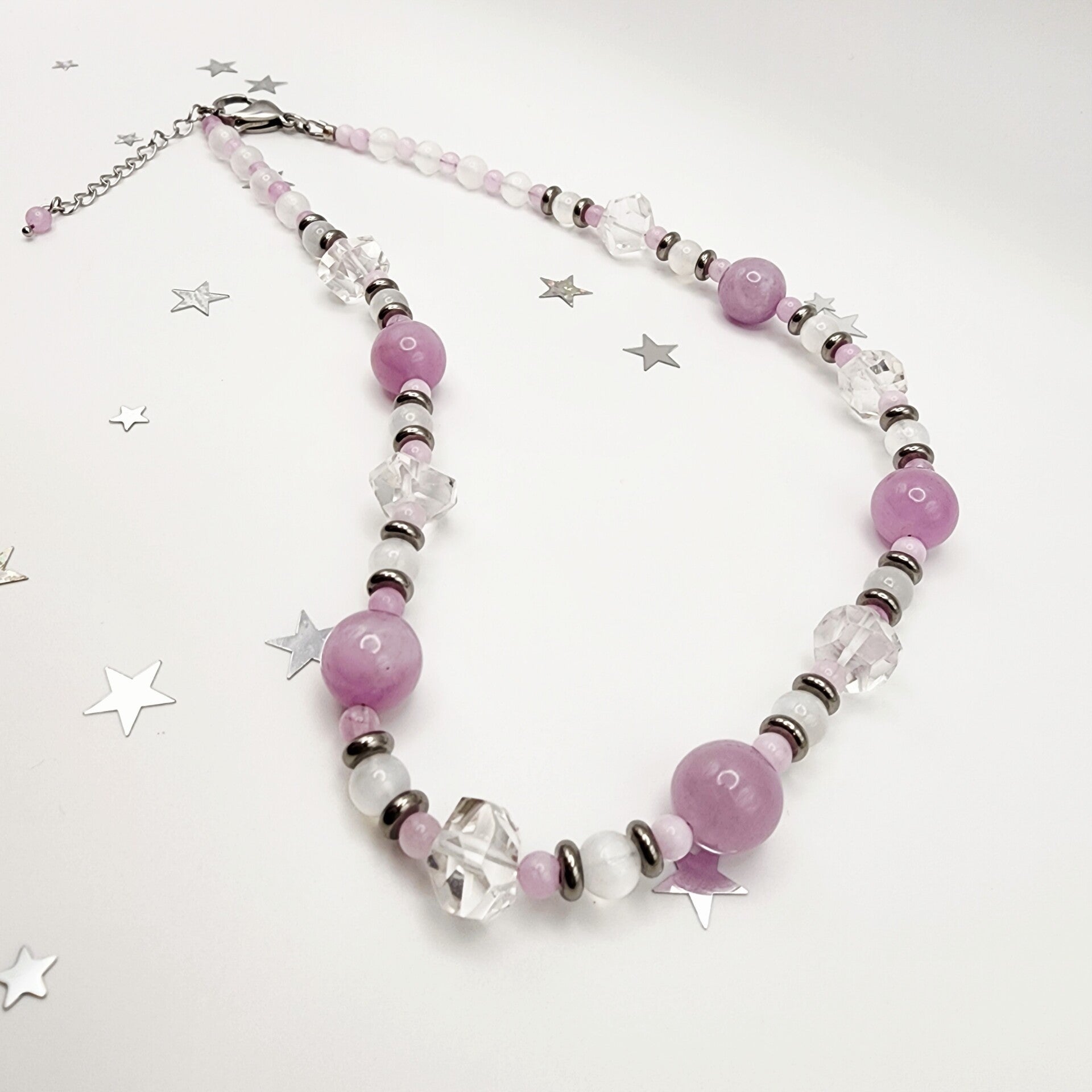 Handcrafted Pink AAA Kunzite, Milky White AAA Selenite & AA Ice-Cut Natural Quartz Necklace in a luminous blend of soft pink and glowing white gemstones designed to catch the light beautifully. Carefully placed stainless steel accent beads add a refined metallic shimmer that complements the gentle sparkle of ice-cut quartz and the serene glow of Kunzite and Selenite.
