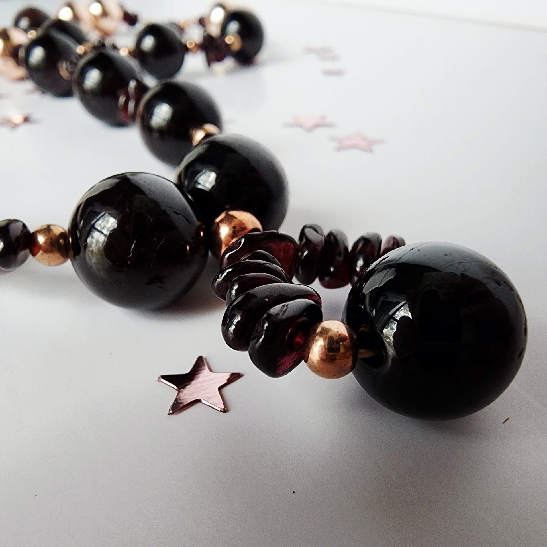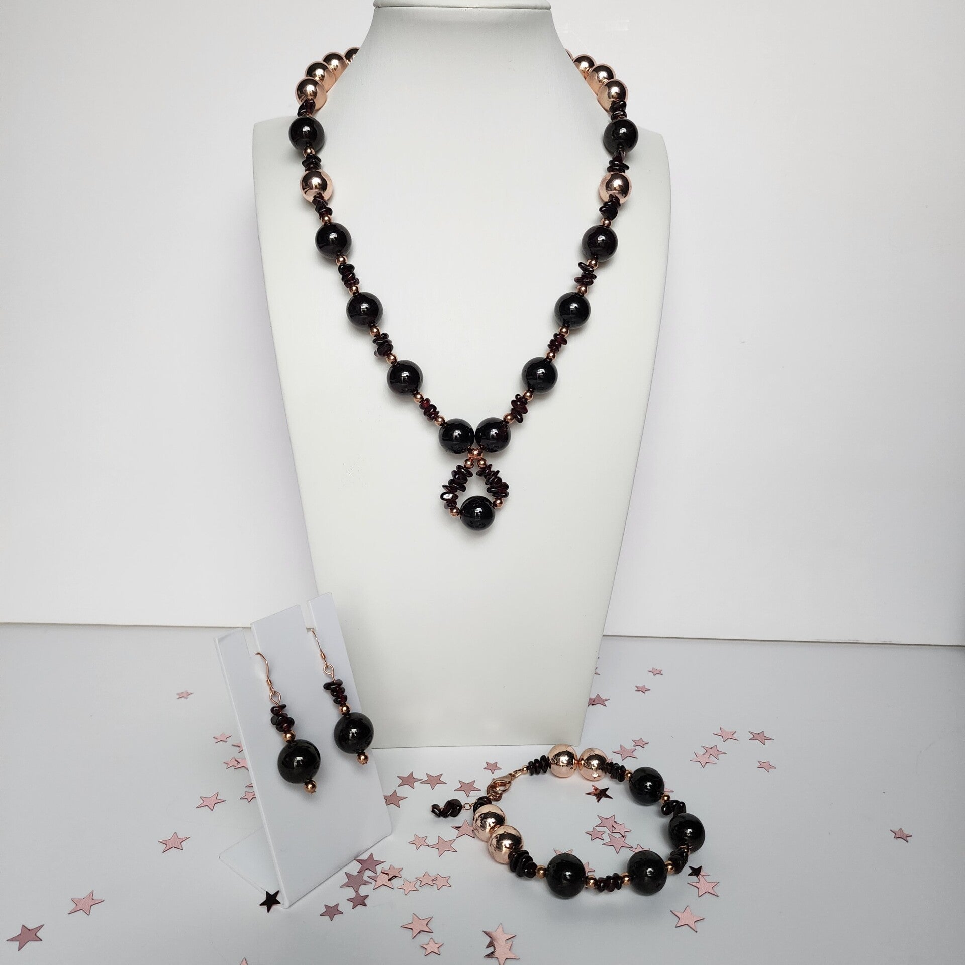 This rich dark crimson Garnet is nearly black and is beautifully paired with warm rose gold Hematite and rose gold filled elements in this elegant, handcrafted 18" adjustable necklace. Designed for lasting beauty, this set offers timeless color with a soft celestial glow.