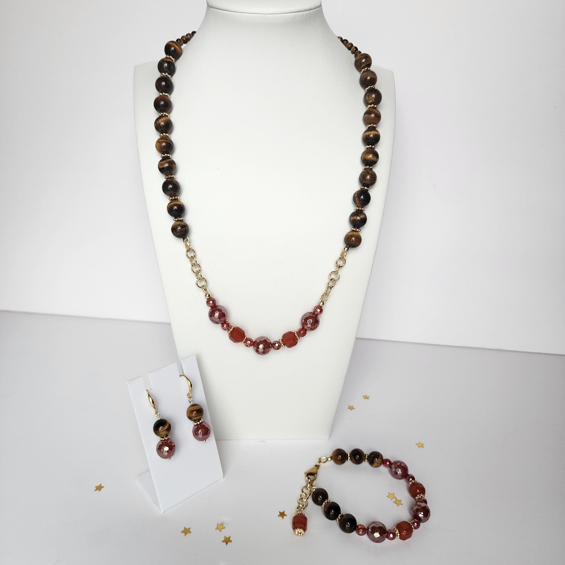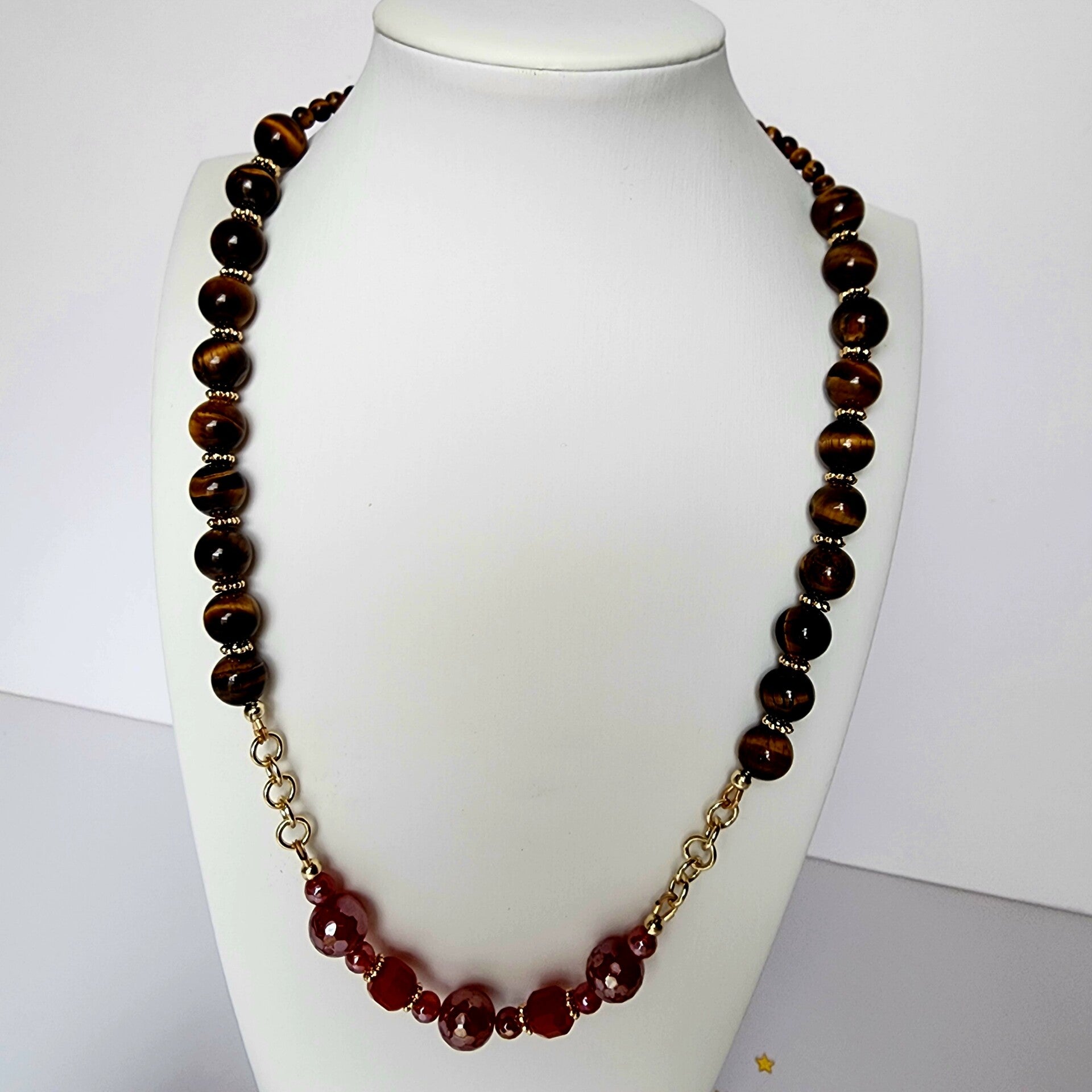 Bold, grounding, and warmly radiant, this 22-24" Carnelian and Tiger’s Eye necklace is handcrafted with glowing natural gemstones and finished in luminous 18K gold filled chain elements and lobster clasp for a refined, lasting shine. Carnelian’s rich amber-red tones pair beautifully with the golden chatoyance of Tiger’s Eye, creating a statement piece that feels both earthy and elegant.