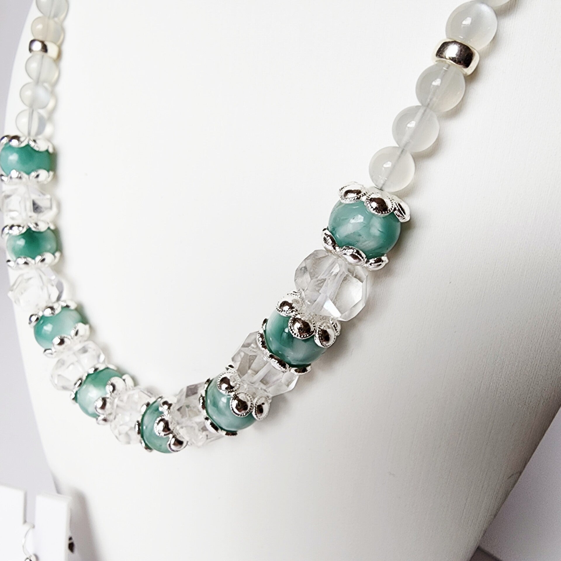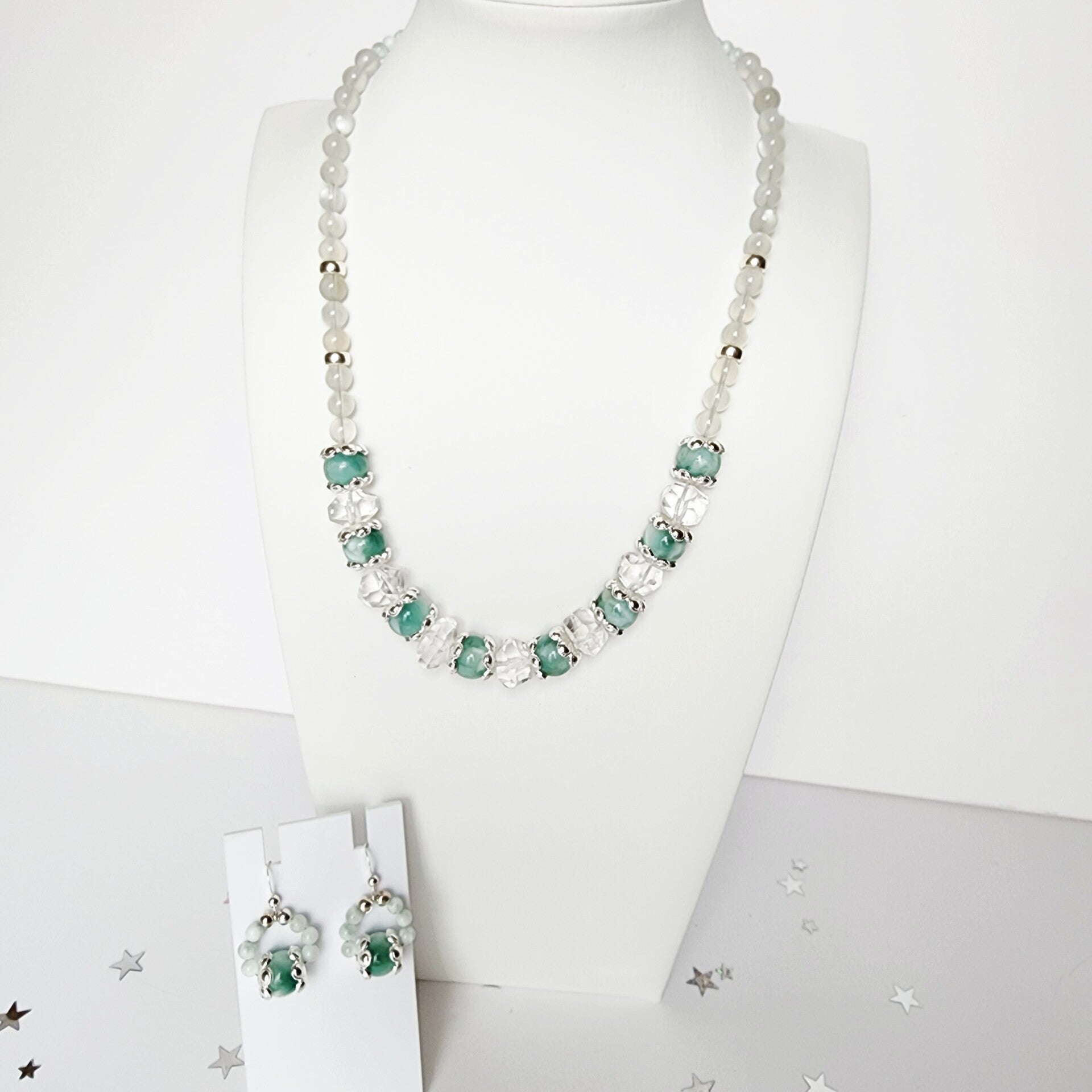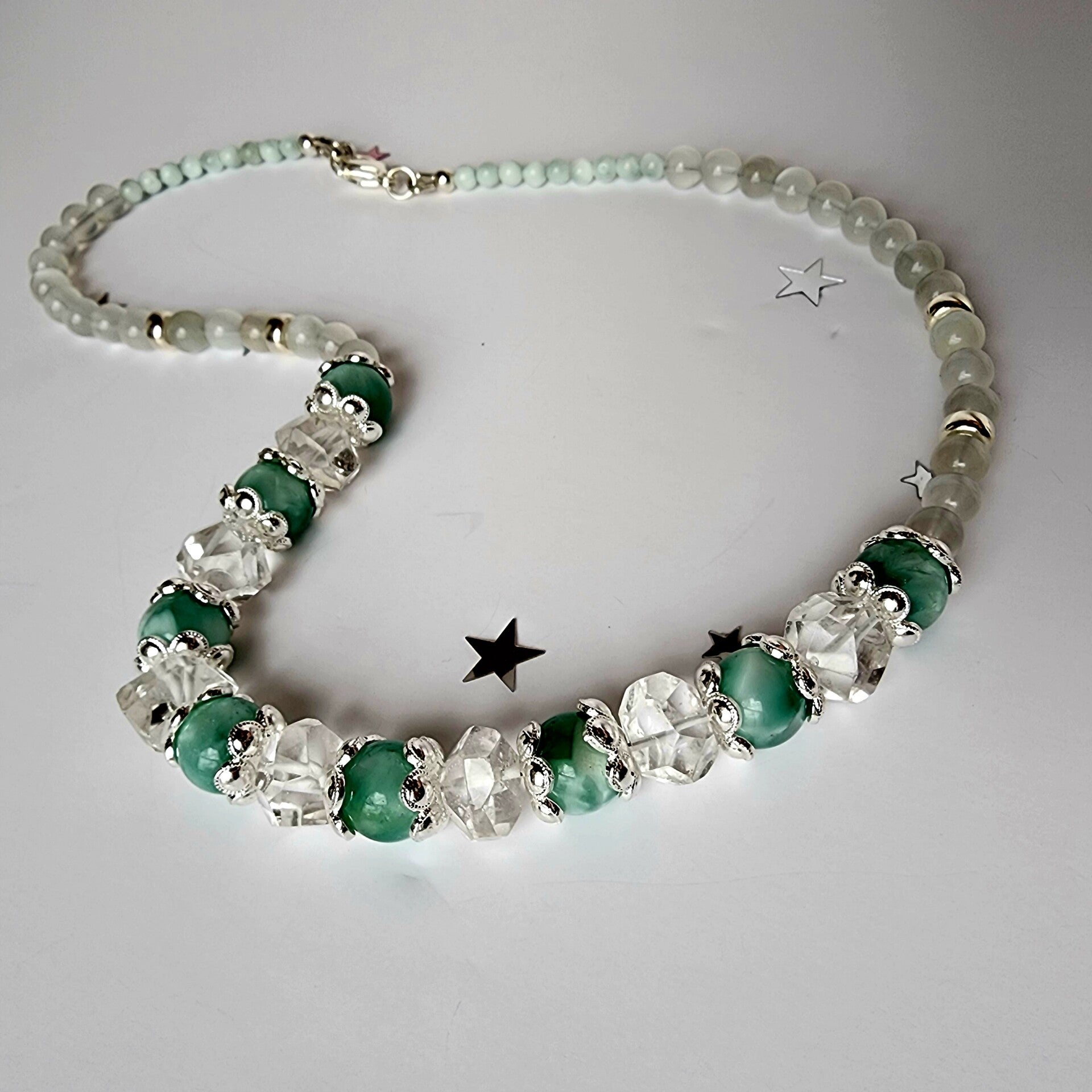 Green Moonstone & Ice-Cut Crystal Quartz Necklace, Sterling Silver