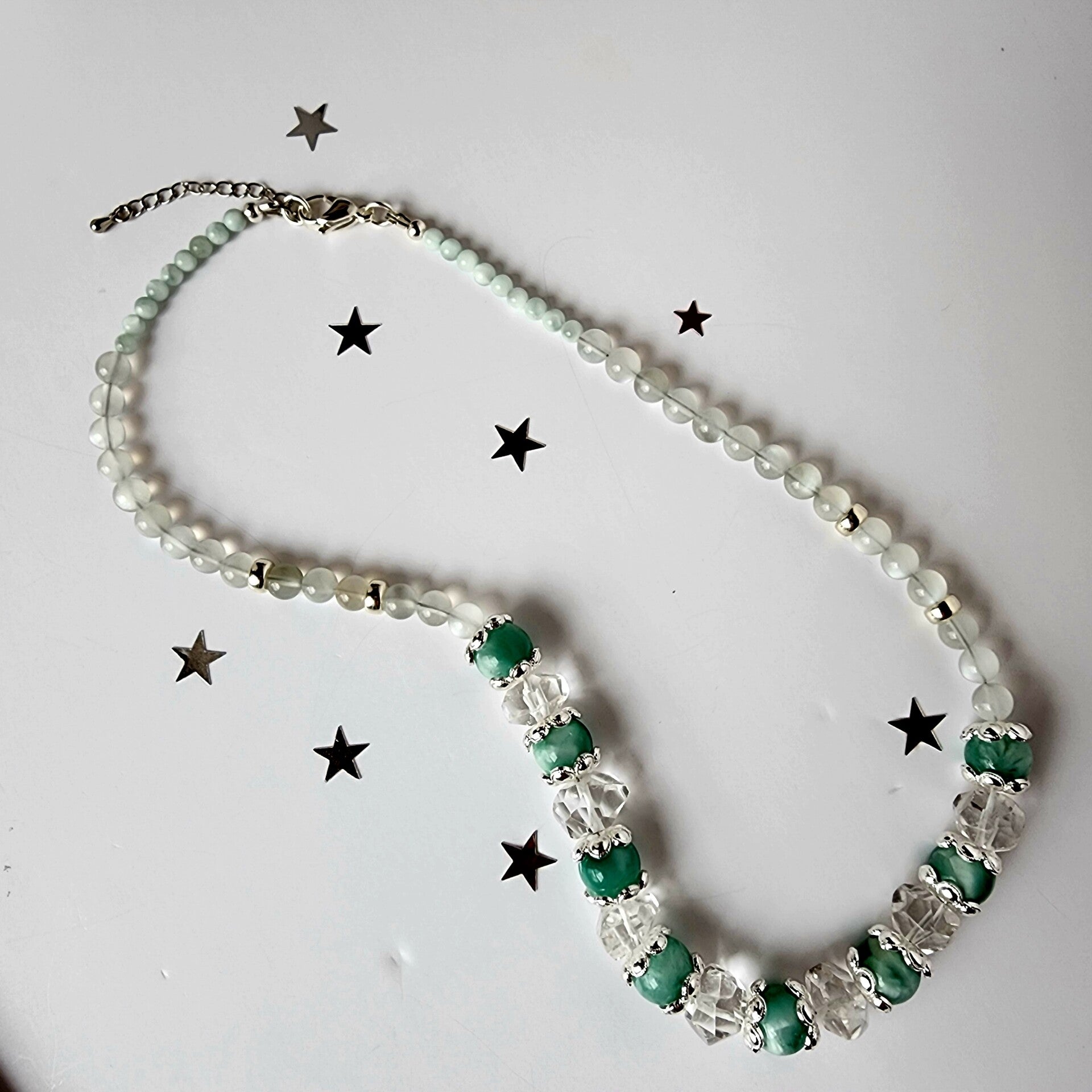 Luminous and softly radiant, this 18" AA Green Moonstone and ice-cut Crystal Quartz necklace is handcrafted in polished sterling silver for a clean, timeless look. The gentle green flash of Moonstone pairs beautifully with the clear Quartz, creating an elegant design that feels light, calming, and refined. It features a luminous blend of carefully selected natural gemstones with bright sterling silver components, and is an expression of quiet luxury and natural beauty. It is finished with a large sterling silver lobster clasp for easy on and off.