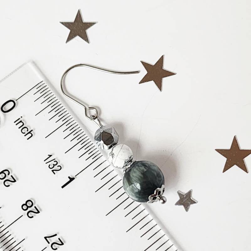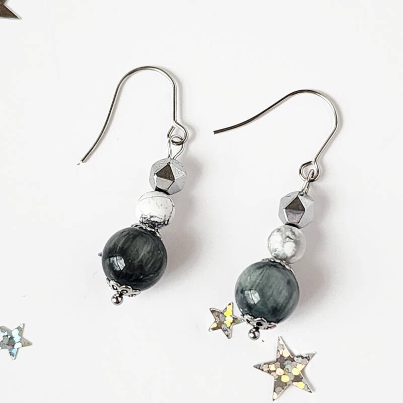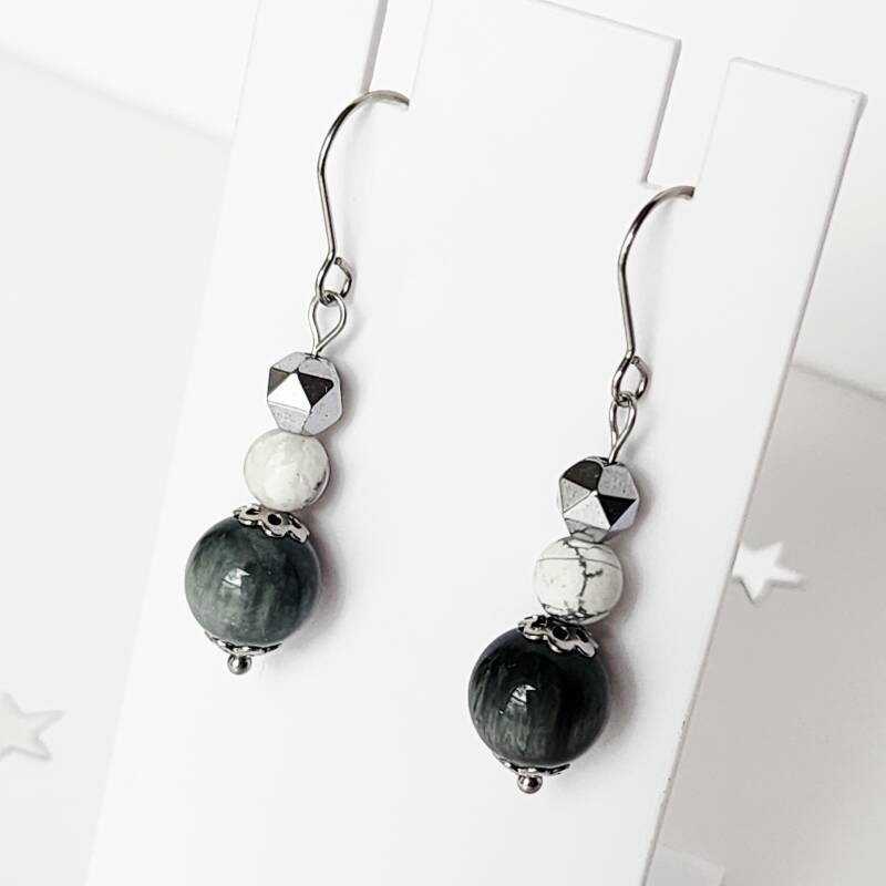 Handcrafted with rare silvery-gray Eagle Eye, calming white Howlite, and polished silver Hematite, this stainless steel pair of dangle earrings brings together contrast, balance, and modern edge.