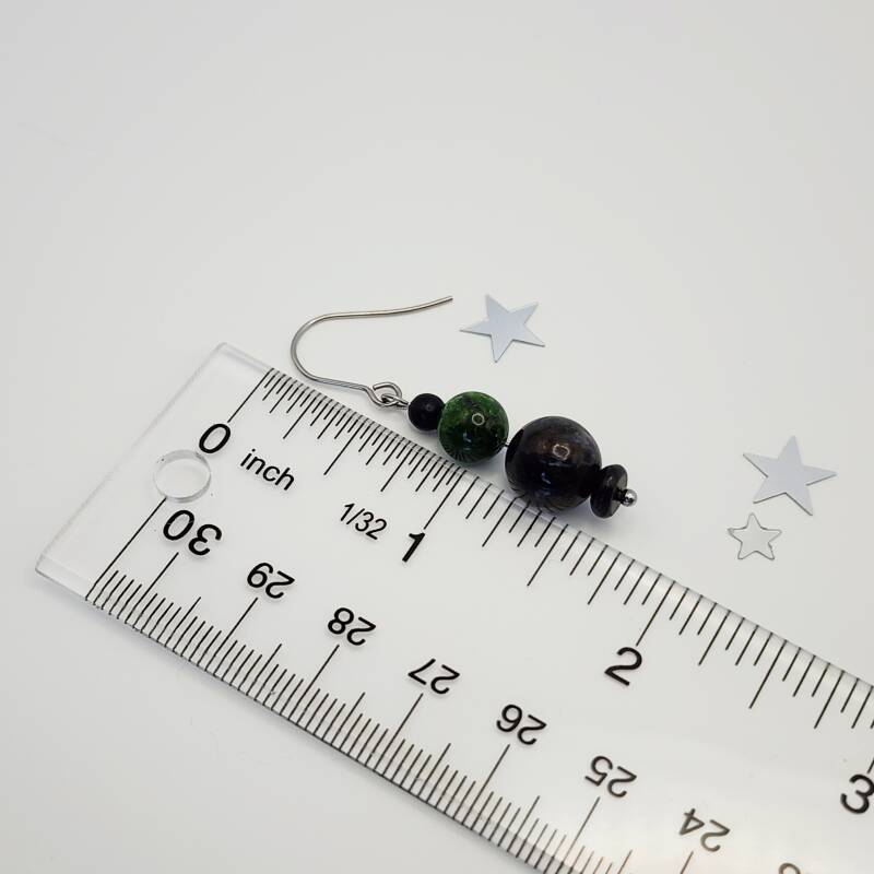Elevate your everyday style with this handcrafted pair of dangle earrings and featuring a rich blend of deep forest-green chrome diopside, silky-sheened hypersthene, and grounding matte black onyx. Finished with durable stainless steel earwires, these earrings are designed for comfortable, everyday wear. Stainless steel offers a hypoallergenic, tarnish-resistant finish, making them a reliable choice for sensitive ears while maintaining their bright, polished appearance over time.